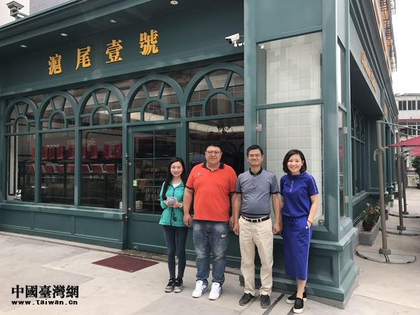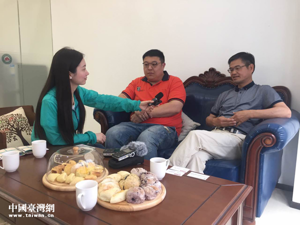 在大陸經(jīng)營面包體驗店的老臺商王江明(右一)從高雄“三顧茅廬”請到了著名烘焙師鄧宇鈞(右二)來廈門一起做面包。圖為老少臺商接受央廣記者李金鑫(左一)采訪。