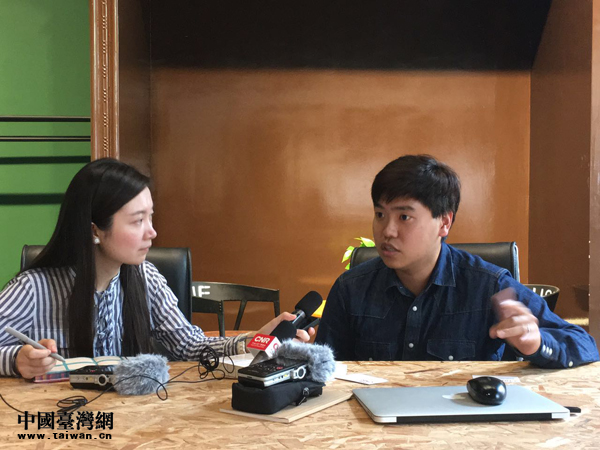 臺灣青年呂紹園(右)2016年放棄了原本薪水優(yōu)沃的工作,帶著電子商務(wù)的夢想來大陸創(chuàng)業(yè)。圖為接受央廣記者李金鑫采訪。