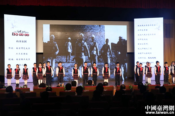臺灣美和科技大學30多位學生齊誦《勝利日》,當視頻連線畫面中傳出“我要用盡生命歌唱,歌唱和平飛翔的曙光,歌唱永生恒在的炎黃!”誦讀聲時,現(xiàn)場報以熱烈的掌聲。隨后,南京大學和美和科技大學兩個會場又通過視頻連線方式,兩岸大學生共同朗誦了由廈門大學黃濤老師創(chuàng)作的《悼念南京大屠殺死難同胞八十周年賦》。“昭昭前事,惕惕后人,唯有富強,可安家邦! 一千多字的賦,蕩氣回腸,充滿力量,逐漸將朗誦會推向了高潮。
