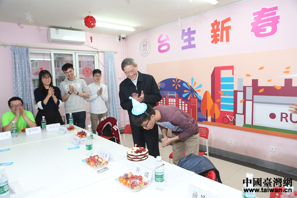 張志軍和同學(xué)們一起為1月份過生日的臺生簡廷軒慶祝生日。