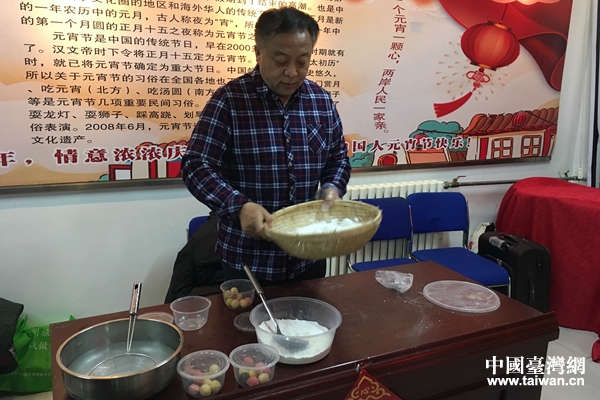 民俗專(zhuān)家李石在右安門(mén)街道現(xiàn)場(chǎng)搖元宵。(中國(guó)臺(tái)灣網(wǎng) 李瑞艷 攝)