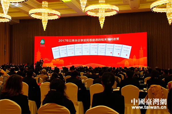 會上展示昆山市2017年以來臺企享受同等待遇的相關(guān)系列政策。(中國臺灣網(wǎng) 汪明珠 攝)