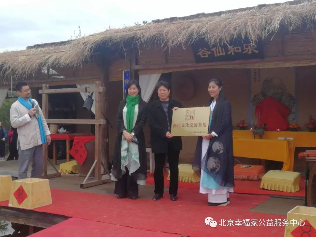 段寶林教授致辭之后,在眾多嘉賓見證下,北京幸福家公益服務(wù)中心與樂和仙谷舉行了兩岸文化交流基地的授牌儀式,雙方將在今后共同推動社會資源的整合,把仙谷建設(shè)成為兩岸傳統(tǒng)文化交流的實(shí)踐基地。北京幸福家公益服務(wù)中心海峽翔云專委會秘書長覃研女士在現(xiàn)場發(fā)言中講到:“幸福家與樂和仙谷在2017年結(jié)緣,共同舉辦過國內(nèi)第一部原創(chuàng)大型古詩詞音樂故事《少年游》的演出活動,演出在社會上反響熱烈。2018年,幸福家與中國文化院共同成立海峽翔云專委會,專委會由原全國人大副委員長許嘉璐先生作為總顧問,致力于推動兩岸民間的文化交流與研究工作。這些年,樂和仙谷在傳統(tǒng)文化的創(chuàng)承、創(chuàng)新、落地實(shí)踐方面已經(jīng)做了大量有意義的工作,也獲得了包括國學(xué)大師樓宇烈教授、生態(tài)文明領(lǐng)域研究專家、國家行政學(xué)張孝德教授等社會各界人士的認(rèn)可。幸福家選擇樂和仙谷作為第一家合作共建的兩岸文化交流基地,希望平谷鄉(xiāng)村的樂和仙谷能夠與幸福家在城市的兩岸文化客廳璦瑅空間,未來充分展開城鄉(xiāng)聯(lián)動,為兩岸的文化交流貢獻(xiàn)力量!