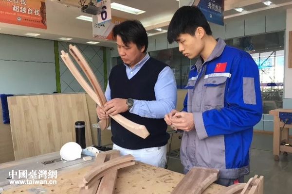 黃上智進(jìn)行木工創(chuàng)作。(圖片來源:上海市臺辦)