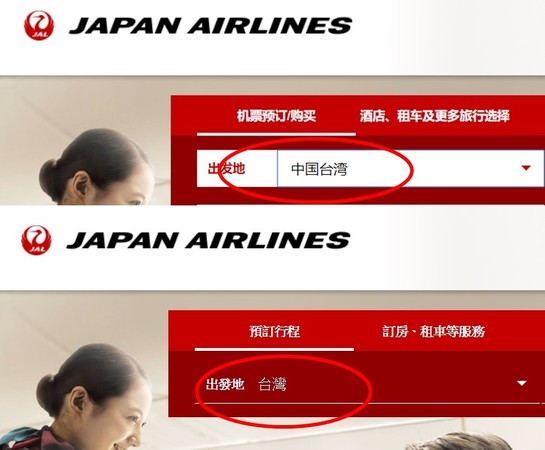 日本航空繁簡中文網(wǎng)站對中國臺灣地區(qū)的標(biāo)注不一。(圖片來自日本航空官網(wǎng))