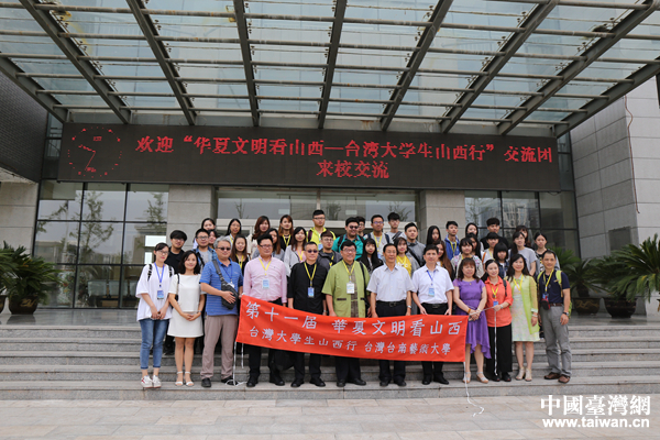 臺灣大學生山西行參訪交流團在山西傳媒學院樓前合影。(中國臺灣網(wǎng) 袁楚 攝)