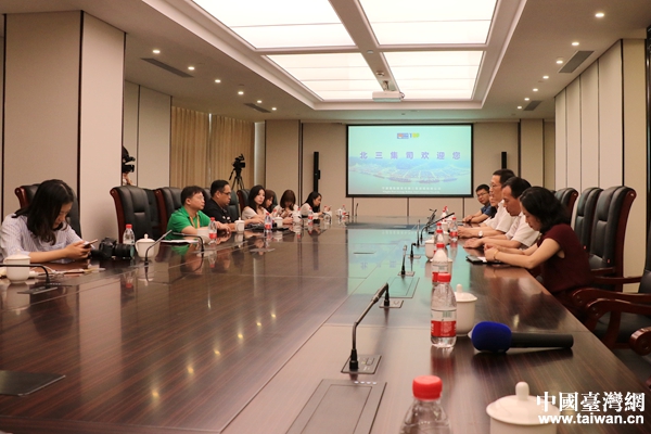 青創(chuàng)基地工作人員為兩岸記者介紹園區(qū)概況。(中國(guó)臺(tái)灣網(wǎng) 李奕均 攝)