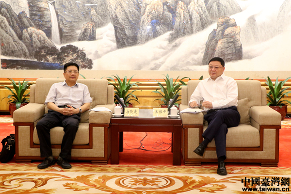 深圳市委書記王偉中(右)會(huì)見(jiàn)“海峽兩岸記者特區(qū)行”聯(lián)合采訪團(tuán)一行,國(guó)務(wù)院臺(tái)辦新聞局局長(zhǎng)馬曉光(左)參與會(huì)見(jiàn)。(中國(guó)臺(tái)灣網(wǎng) 尹賽楠 攝)