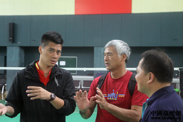 羽毛球雙打世界冠軍傅海峰與臺(tái)灣大學(xué)羽毛球隊(duì)領(lǐng)隊(duì)李坤培教授交流。(中國臺(tái)灣網(wǎng) 李奕均 攝)