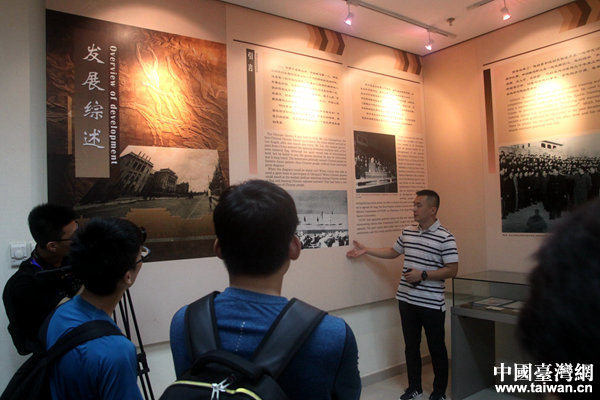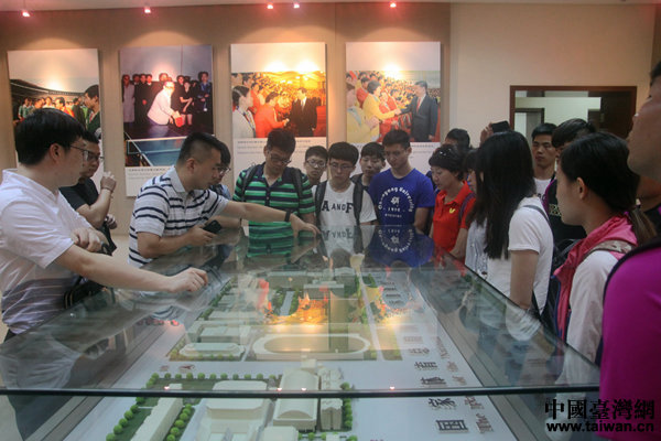 榮譽(yù)館內(nèi)工作人員為臺(tái)灣運(yùn)動(dòng)員講解我國在“奧運(yùn)會(huì)”中的征程。(中國臺(tái)灣網(wǎng) 李奕均 攝)