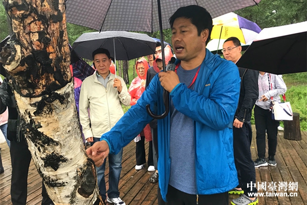 王立軍為三地臺籍青年講解樺樹生長特點。(中國臺灣網(wǎng) 趙苗青 攝)