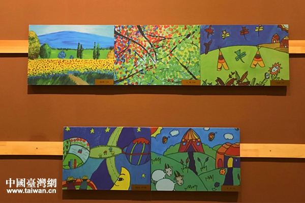 塞罕壩展覽館內(nèi)陳列的孩子們以青山綠水為主題繪制的畫作。(中國臺灣網(wǎng) 趙苗青 攝)