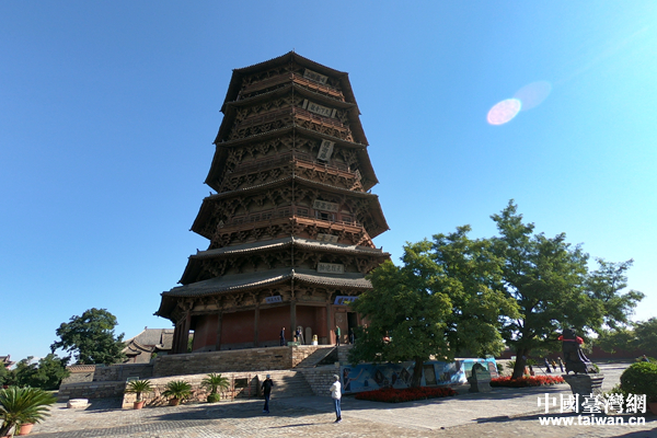 全部榫卯結(jié)構(gòu)建筑的應(yīng)縣木塔外景。(中國(guó)臺(tái)灣網(wǎng) 袁楚 攝)