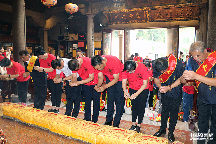 湄洲媽祖祖廟廟方代表陪同長(zhǎng)島顯應(yīng)宮媽祖金身護(hù)送團(tuán)代表向祖廟媽祖進(jìn)香。(中國(guó)臺(tái)灣網(wǎng) 何建峰 攝)