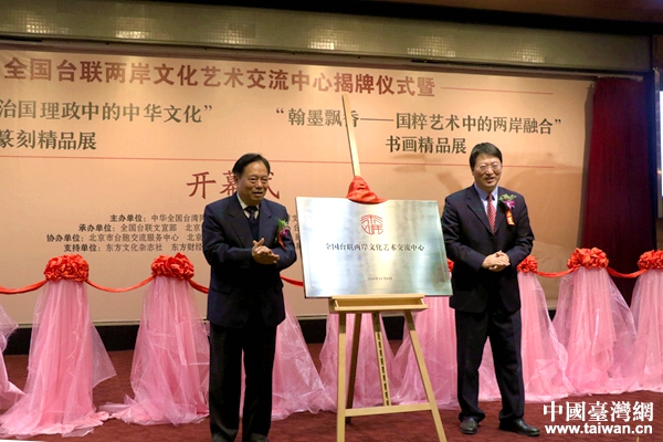 全國臺聯(lián)原黨組書記梁國揚、全國臺聯(lián)副會長鄭平為“全國臺聯(lián)兩岸文化藝術交流中心”揭牌。(中國臺灣網(wǎng) 張露露 攝)