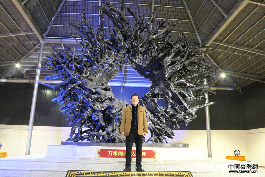 臺(tái)商盧泓杰與成都烏木藝術(shù)博物館鎮(zhèn)館之寶“萬(wàn)根同心太陽(yáng)神”。