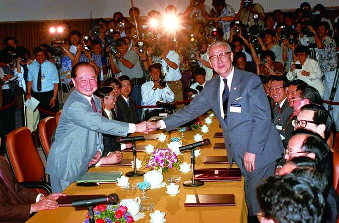 1993年4月27日,首次“汪辜會談”在新加坡開始,海協(xié)會和;鶗砀10人參加了會談,這是海峽兩岸授權民間機構領導人的第一次晤談。會談前汪道涵(左)與辜振甫握手。 新華社發(fā)