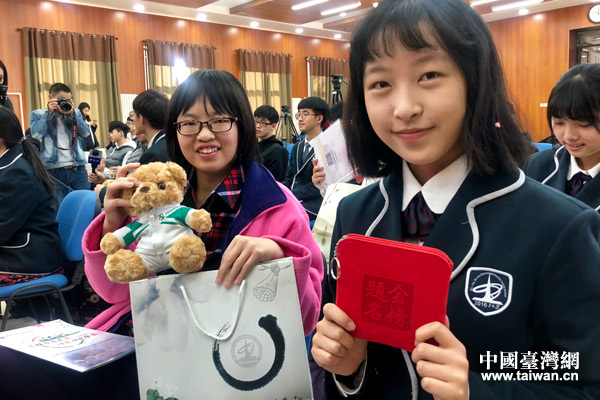 兩岸學(xué)生展示對方送給自己的禮物。(中國臺灣網(wǎng) 楊旋 攝)