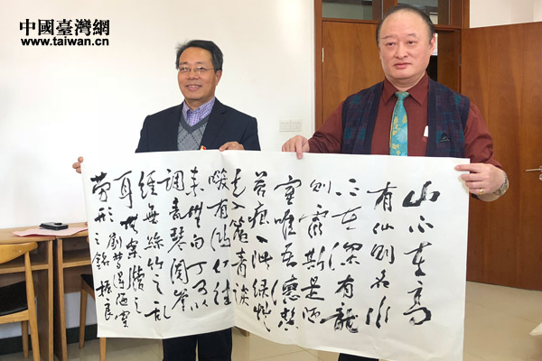 臺灣參訪團(tuán)團(tuán)長展示自己寫的毛筆字版《陋室銘》。(中國臺灣網(wǎng) 楊旋 攝)