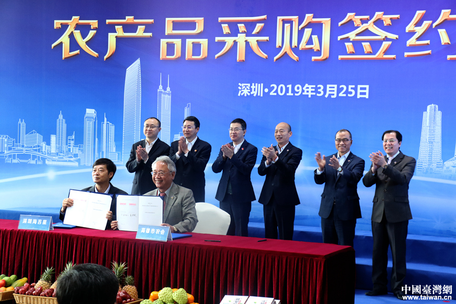 3月25日,韓國瑜一行喜提大陸超大訂單:深圳市吉星國際農(nóng)產(chǎn)品管理有限公司代表深圳市4家公司同高雄市農(nóng)會簽訂協(xié)議,未來起4年內(nèi)采購高雄出產(chǎn)的農(nóng)產(chǎn)品共計人民幣兩億元。韓國瑜市長在簽約儀式上又露出了標(biāo)志性的萌萌噠微笑~