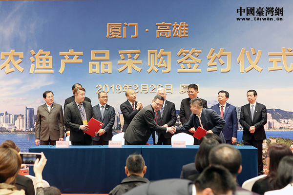 中國(guó)臺(tái)灣網(wǎng)3月26日廈門訊 3月26日下午,廈門與高雄兩地企業(yè)舉行農(nóng)漁產(chǎn)品采購(gòu)簽約儀式,雙方希望能攜手精誠(chéng)合作,繼續(xù)把貿(mào)易做大,互利共贏。廈門市副市長(zhǎng)韓景義、高雄市市長(zhǎng)韓國(guó)瑜共同見證了簽約儀式。