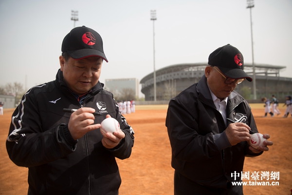 國臺(tái)辦副主任龍明彪、海峽兩岸棒球交流合作委員會(huì)名譽(yù)主席彭誠浩在棒球上簽名(中國臺(tái)灣網(wǎng)發(fā) 主辦方供圖)