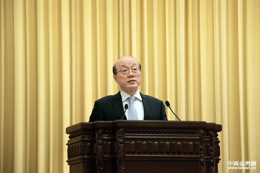 中共中央臺(tái)辦、國(guó)務(wù)院臺(tái)辦主任劉結(jié)一在全國(guó)臺(tái)企聯(lián)會(huì)員代表大會(huì)暨第四、五屆會(huì)長(zhǎng)交接典禮上講話。(中國(guó)臺(tái)灣網(wǎng) 張潔 攝)