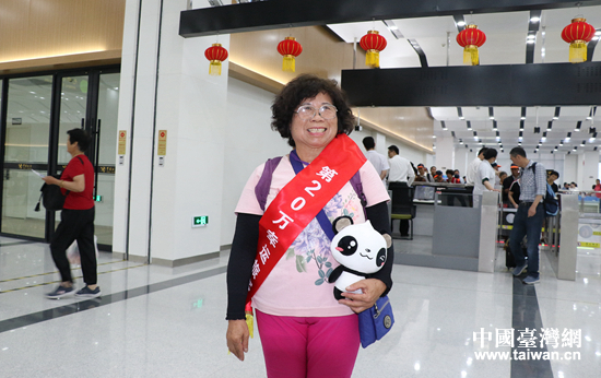 來自臺中的劉細妹是玉環(huán)市大麥嶼港對臺直航第20萬人次幸運旅客。(中國臺灣網 普燕 攝)