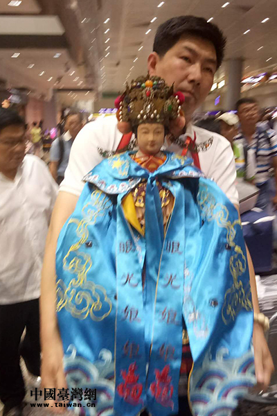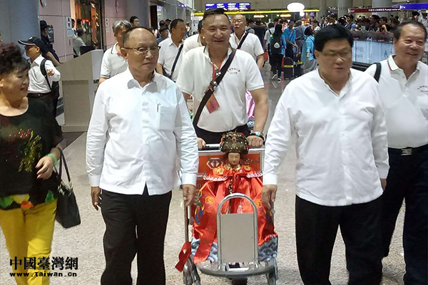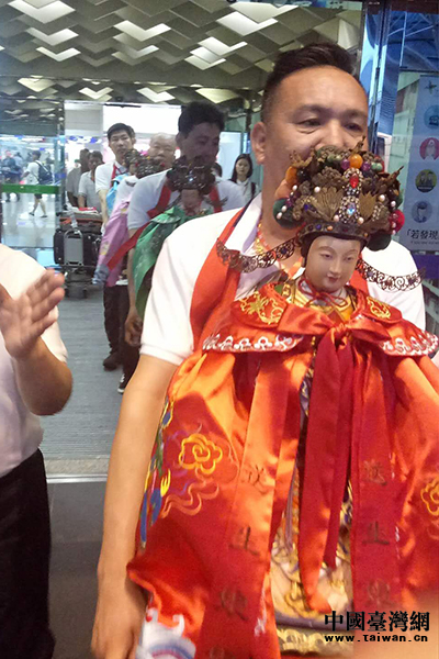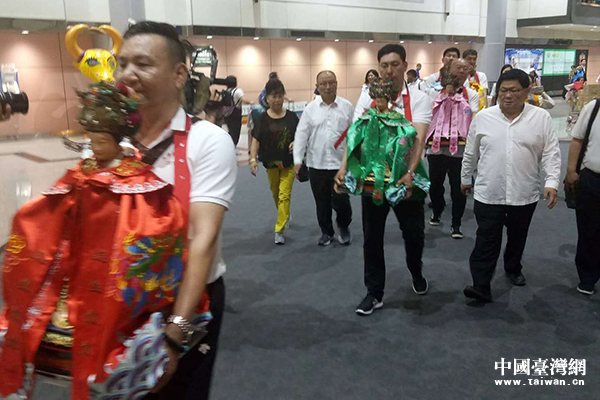 兩岸宮廟人士護(hù)送媽祖走出機(jī)場(chǎng)。(中國(guó)臺(tái)灣網(wǎng) 發(fā))