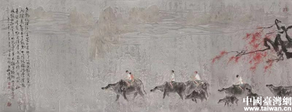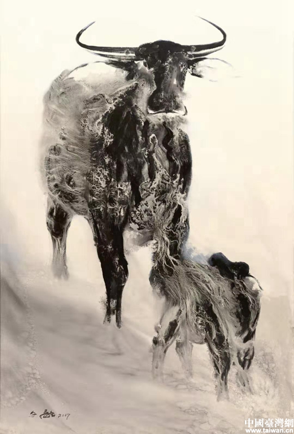“線條”一直以來(lái)是東方藝術(shù)強(qiáng)調(diào)的核心表征,因此許文融選擇“線條”作為他水墨、油畫及雕塑等不同媒材創(chuàng)作上的連結(jié)。此次來(lái)蘇州展覽的作品既有水墨、油畫作品,也有雕塑。他的“文人草書雕塑”系列,以不銹鋼或青銅作為媒材,運(yùn)用草書書寫古代詩(shī)文,成為詩(shī)、書、境、形于一體的三度空間立體雕塑。如《醉月》《行云》等作品,通過(guò)李白、蘇東坡的詩(shī)詞與形象連結(jié),形成另一種東方形而上的美學(xué)馳想。這種藝術(shù)的抽象,也存在于他的水墨作品如《青山綠水任遨游》《云山多自在》等一系列的意象畫中。“西方的雕塑手法也可以運(yùn)用于東方傳統(tǒng)水墨畫之中,”許文融介紹說(shuō),這兩幅水墨畫背景都以金石碑帖的反白字書法為底,輔以留白,線條交錯(cuò)勾勒,象征高山流水,然后再勾畫牧童、牛等,使具象與抽象產(chǎn)生對(duì)話。