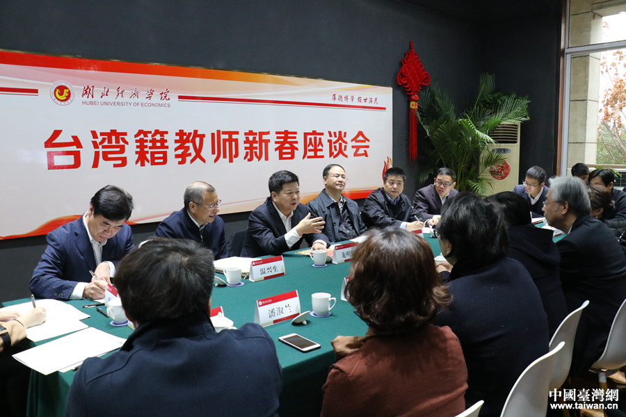 中共中央臺(tái)辦、國(guó)務(wù)院臺(tái)辦副主任龍明彪與湖北經(jīng)濟(jì)學(xué)院臺(tái)籍教師座談交流。(中國(guó)臺(tái)灣網(wǎng) 李寧 攝)