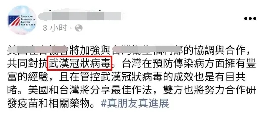 AIT這則新聞稿上稱呼“武漢肺炎”,民進(jìn)黨當(dāng)局第一時(shí)間回應(yīng),也稱呼“武漢肺炎”。原本,民進(jìn)黨當(dāng)局包括副領(lǐng)導(dǎo)人當(dāng)選人賴清德、陸委會等,日前都已改口稱為新冠肺炎,對于中國大陸釋出善意。但美方主動拋出與臺灣在新冠肺炎疫苗的合作,拉近與臺灣的關(guān)系,臺灣方面緊跟美國態(tài)度,又稱回“武漢肺炎”,顯示美國對兩岸關(guān)系和緩發(fā)展扮演拉扯力量。