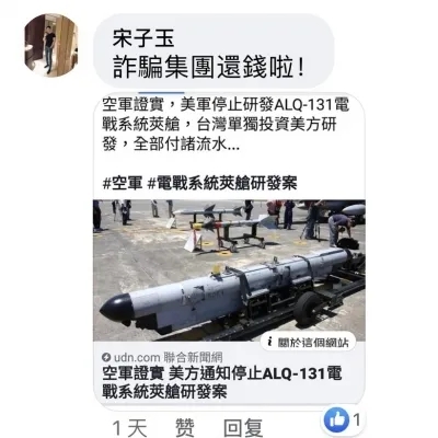 病毒無國界,合作開發(fā)疫苗藥物本是好事,就怕民進(jìn)黨當(dāng)局重交“學(xué)費(fèi)”,畢竟,日前美軍通知,ALQ—131電戰(zhàn)系統(tǒng)莢艙研發(fā)案已經(jīng)停止。(林梅丹)