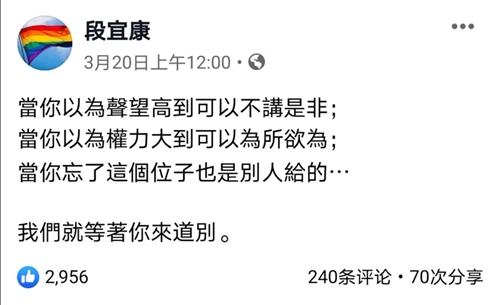 不久前,民進(jìn)黨前民代段宜康在臉書(shū)上發(fā)文,稱(chēng)“當(dāng)你以為聲望高到可以不講是非;當(dāng)你以為權(quán)力大到可以為所欲為;當(dāng)你忘了這個(gè)位子也是別人給的?我們就等著你來(lái)道別”。雖然沒(méi)有直接點(diǎn)名,但明眼人一看就知道說(shuō)的是蘇貞昌。段宜康這段話被認(rèn)為是選后民進(jìn)黨內(nèi)新潮流系與蘇系權(quán)力斗爭(zhēng)的公開(kāi)化。