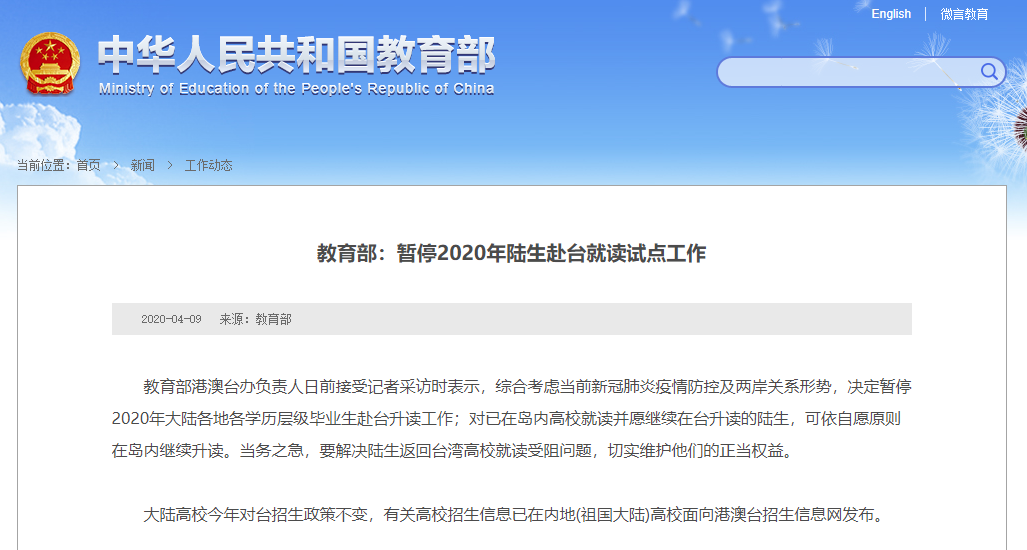 日前,教育部港澳臺辦負(fù)責(zé)人表示,綜合考慮當(dāng)前新冠肺炎疫情防控及兩岸關(guān)系形勢,決定暫停2020年大陸各地各學(xué)歷層級畢業(yè)生赴臺升讀工作;對已在島內(nèi)高校就讀并愿繼續(xù)在臺升讀的陸生,可依自愿原則在島內(nèi)繼續(xù)升讀。