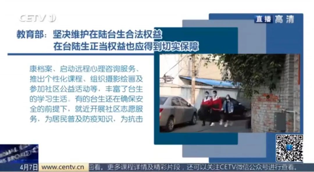 疫情發(fā)生后,大陸教育部門要求大陸各高校精準(zhǔn)了解每位在讀臺灣學(xué)生情況,落實(shí)屬地防疫措施,提醒臺生做好自身防護(hù),確保臺生健康有保障,組織開展線上教學(xué),“停課不停學(xué)”。很多高校為臺生推出了一系列暖心舉措,豐富在陸臺生學(xué)習(xí)生活。目前,在陸臺生無一感染。