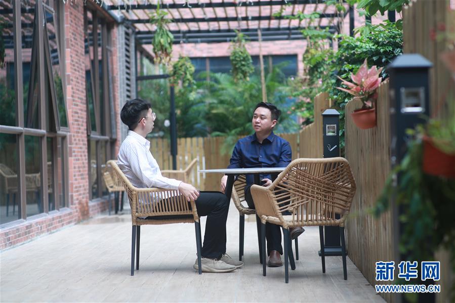 5月18日,陳鴻杰(右)在匯龍臺(tái)港澳青年創(chuàng)新創(chuàng)業(yè)基地與工作人員討論工作。新華社記者盧燁攝