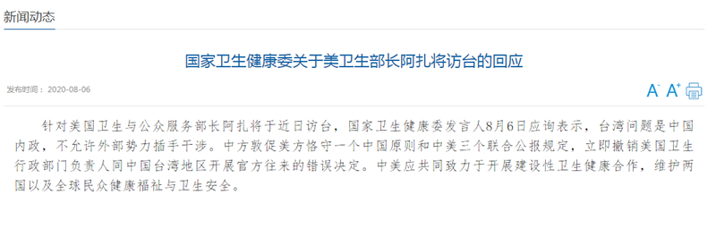 - 國(guó)家衛(wèi)生健康委關(guān)于美衛(wèi)生部長(zhǎng)阿扎將訪臺(tái)的回應(yīng)