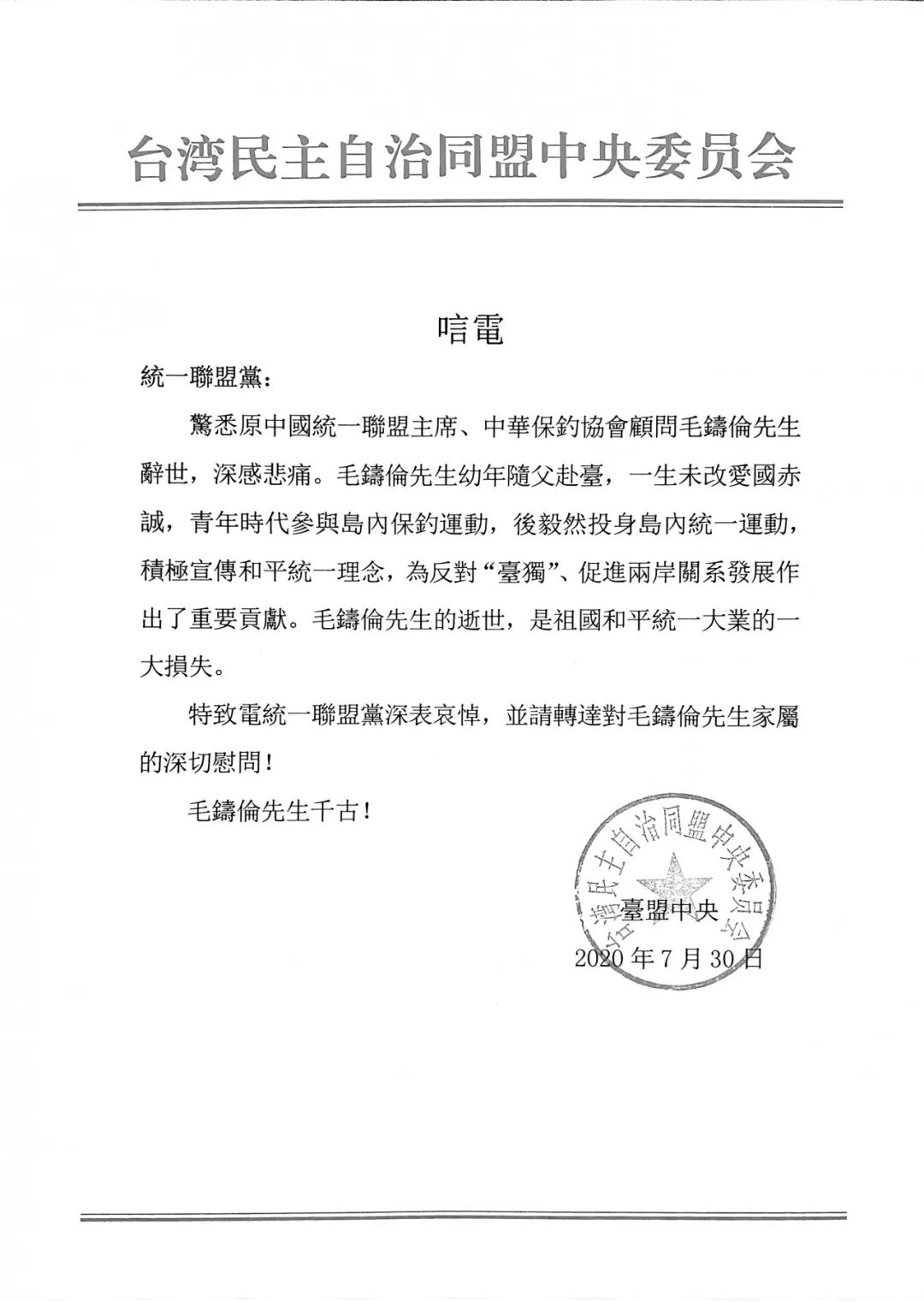 毛鑄倫先生、王曉波先生追思會(huì)在臺(tái)北舉行 臺(tái)盟致唁電
