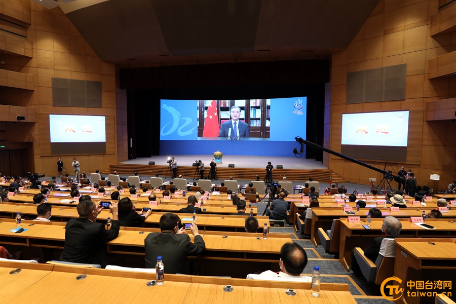 中共中央政治局常委、全國政協(xié)主席汪洋在大會上發(fā)表視頻致辭。(中國臺灣網(wǎng) 尹賽楠 攝)