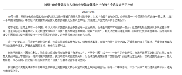 中國(guó)駐印度大使館16日就印媒播出“臺(tái)獨(dú)”專訪發(fā)表嚴(yán)正聲明!