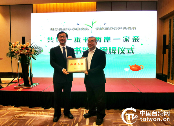 農(nóng)業(yè)農(nóng)村部辦公廳(對臺灣農(nóng)業(yè)事務(wù)辦公室)副主任劉均勇(左),為“海峽書架”受贈方代表贈牌。(中國臺灣網(wǎng) 王思羽 攝)