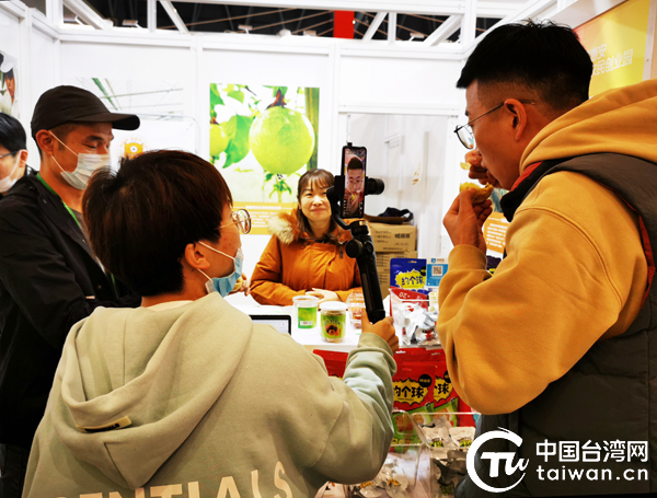 線上直播環(huán)節(jié)安排主播現(xiàn)場(chǎng)逛展、試吃,幫臺(tái)農(nóng)直播帶貨。(中國(guó)臺(tái)灣網(wǎng) 王思羽 攝)