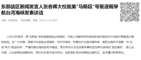 東部戰(zhàn)區(qū)新聞發(fā)言人張春暉大校19日就美“馬斯廷”號驅(qū)逐艦穿航臺灣海峽發(fā)表談話。