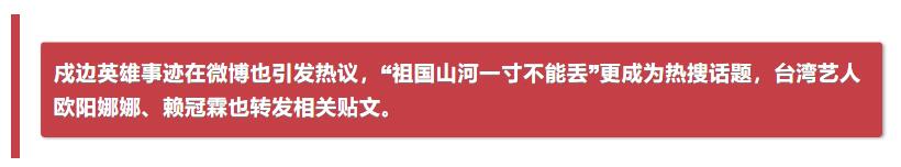 戍邊英雄事跡在微博也引發(fā)熱議,“祖國山河一寸不能丟”更成為熱搜話題,臺灣藝人歐陽娜娜、賴冠霖也轉發(fā)相關貼文。