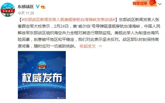 中國(guó)臺(tái)灣網(wǎng)2月25日北京訊 據(jù)@東部戰(zhàn)區(qū) 微博25日消息,東部戰(zhàn)區(qū)新聞發(fā)言人張春暉空軍大校就美艦穿航臺(tái)灣海峽發(fā)表談話表示,2月24日,美“威爾伯”號(hào)導(dǎo)彈驅(qū)逐艦穿航臺(tái)灣海峽,中國(guó)人民解放軍東部戰(zhàn)區(qū)組織?毡θ虒(duì)其進(jìn)行跟蹤監(jiān)視。美艦此舉人為制造臺(tái)海風(fēng)險(xiǎn)因素,刻意破壞地區(qū)和平穩(wěn)定,我們對(duì)此表示堅(jiān)決反對(duì)。戰(zhàn)區(qū)部隊(duì)時(shí)刻保持高度戒備,隨時(shí)應(yīng)對(duì)一切威脅挑釁。(完)