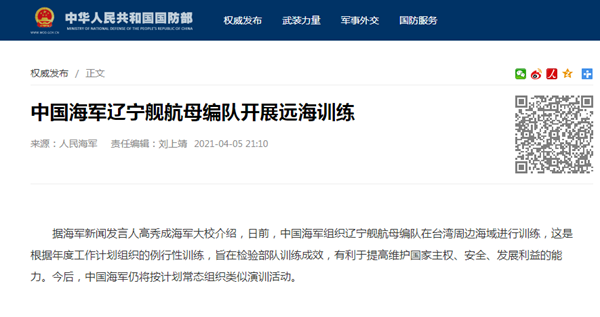 中國臺灣網4月6日訊 據海軍新聞發(fā)言人高秀成海軍大校介紹,日前,中國海軍組織遼寧艦航母編隊在臺灣周邊海域進行訓練,這是根據年度工作計劃組織的例行性訓練,旨在檢驗部隊訓練成效,有利于提高維護國家主權、安全、發(fā)展利益的能力。今后,中國海軍仍將按計劃常態(tài)組織類似演訓活動。(完)