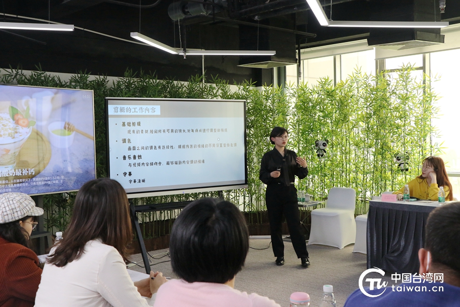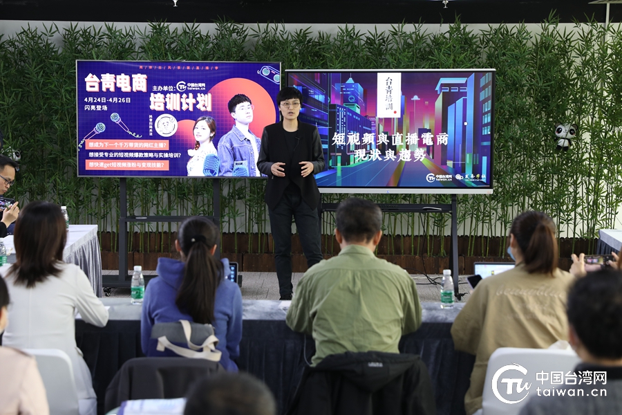 4月25日,由中國(guó)臺(tái)灣網(wǎng)舉辦的海峽兩岸古風(fēng)茶裳直播季·臺(tái)青電商培訓(xùn)進(jìn)行中。圖為發(fā)條學(xué)社C00、新媒體電商資深從業(yè)者夏夢(mèng)琪講解如何打造爆款短視頻。(中國(guó)臺(tái)灣網(wǎng) 張亞靜 攝)