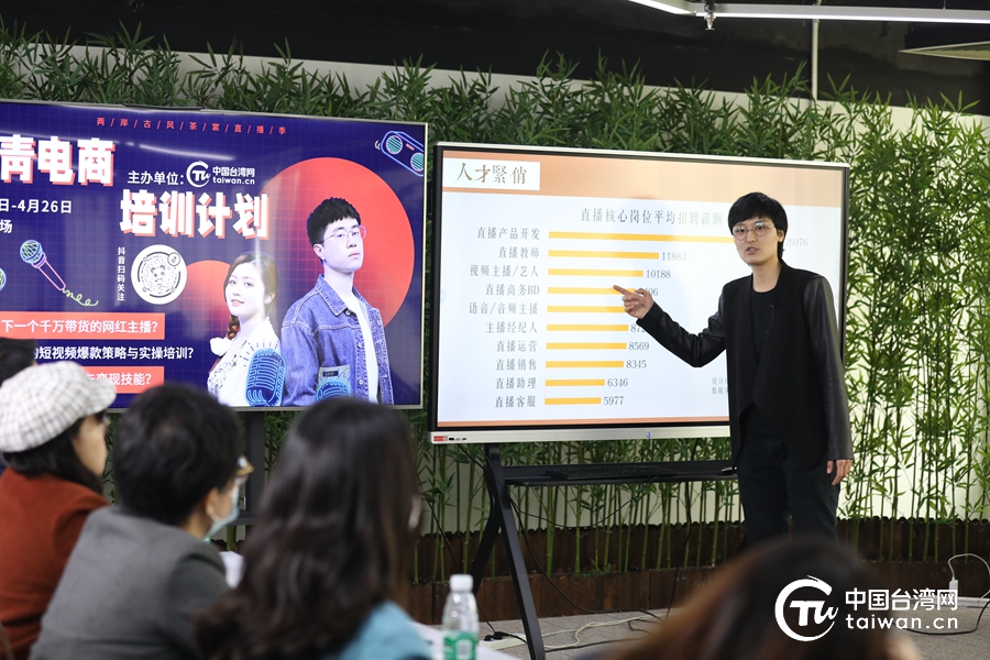 4月25日,由中國(guó)臺(tái)灣網(wǎng)舉辦的海峽兩岸古風(fēng)茶裳直播季·臺(tái)青電商培訓(xùn)進(jìn)行中。圖為發(fā)條學(xué)社CEO、新媒體電商資深從業(yè)者金風(fēng)介紹短視頻與直播電商現(xiàn)狀與趨勢(shì)。(中國(guó)臺(tái)灣網(wǎng) 張秉鐸 攝)