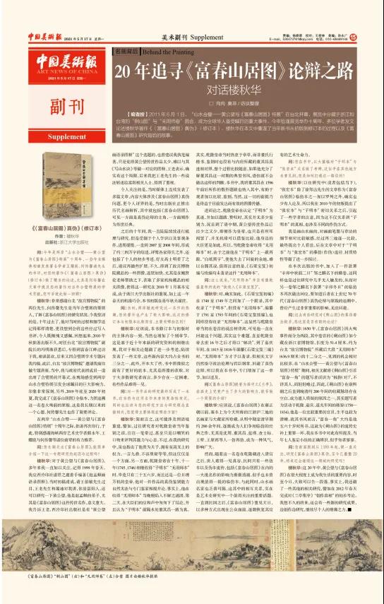 樓秋華:非常感謝臺北“故宮博物院”的兩位先生。何傳馨先生是當(dāng)年合璧展的策展人,了解《富春山居圖》的研究狀況。令我驚訝的是,十年過去了,他對當(dāng)時(shí)的過程和細(xì)節(jié)還記得那樣清楚,更沒想到會將這些經(jīng)過寫入書評,令人既慚愧又感佩;叵肫饋,2010年秋拙著出版不久,時(shí)任臺北“故宮博物院”副院長的馮明珠獲悉后,專程到富春江畔過訪于我,相談甚歡,后來又因合璧展學(xué)術(shù)專題向我約稿。此后,臺北“故宮博物院”邀請我前往做專題講座。當(dāng)中,我與政府代表團(tuán)成員一道出席了合璧展的開幕式。在現(xiàn)場感受到兩岸山水合璧特展引發(fā)全球矚目的巨大影響力,印象非常深刻。另外,2019年底至2020年初夏,我完成了《富春山居圖》全臨本,力圖追溯這一名卷火殉前的原貌,這是我長期以來的一個(gè)心愿。何傳馨先生也作了簡要評論。
